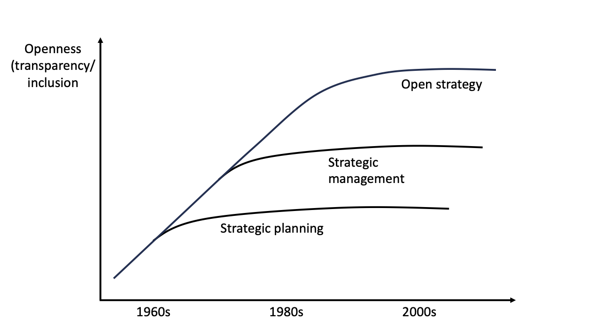 Schematic representation of the evolving contributions of Strategic Planning, Strategic Management, and Open Strategy to strategic openness over time.[1]
